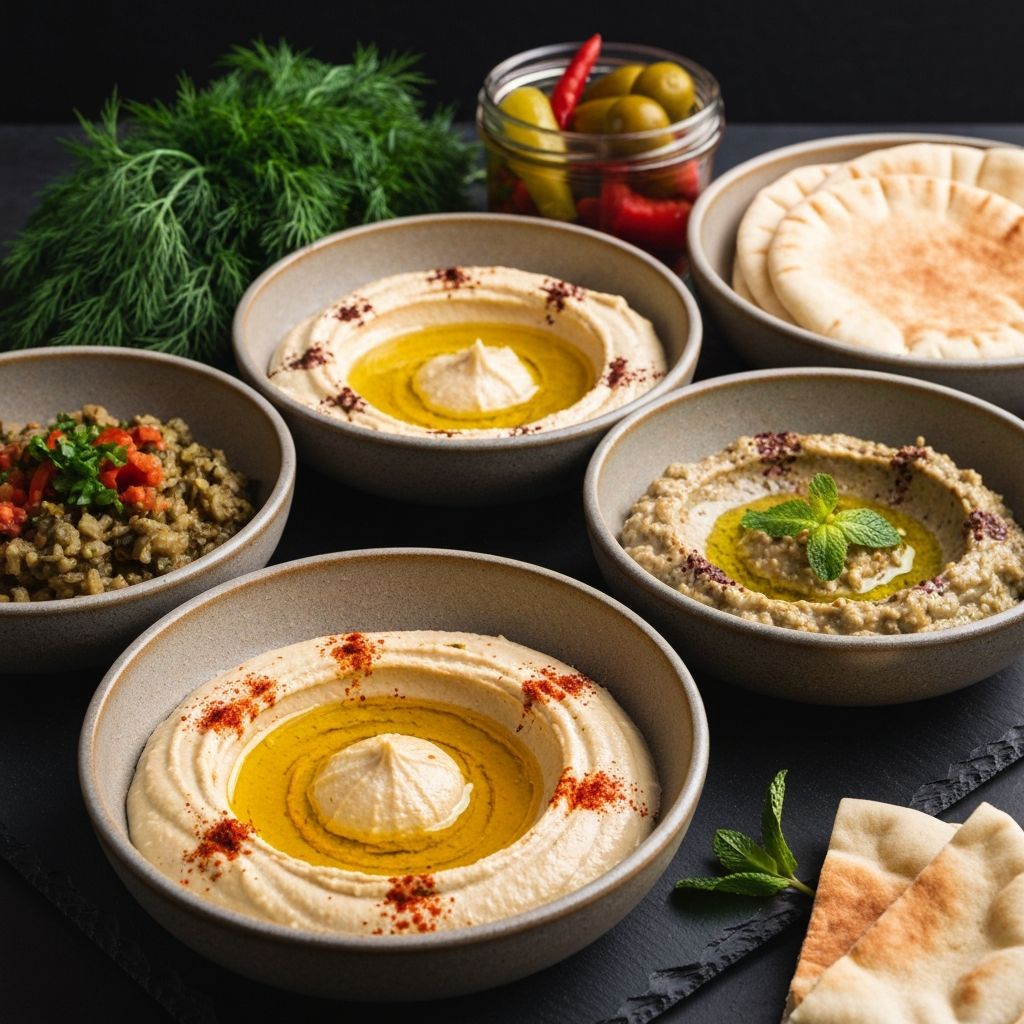 Every dip is crafted in-house — silky hummus drizzled with olive oil, smoky baba ganoush, and tangy house pickles that bring the whole spread to life.